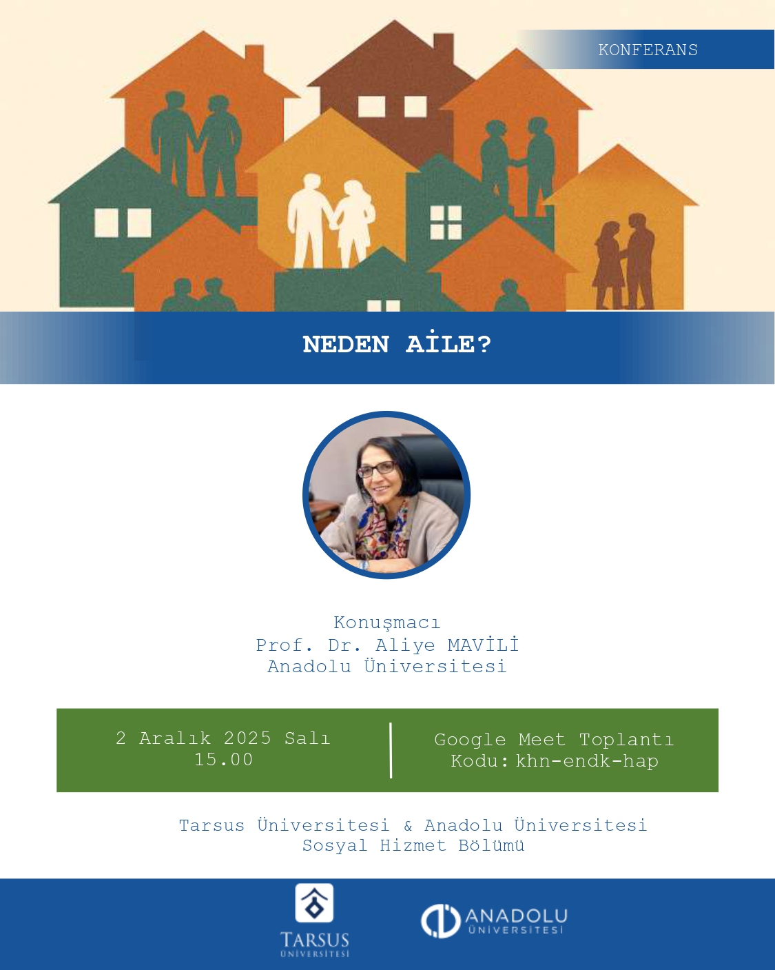 Tarsus Üniversitesi ve Anadolu Üniversitesi Sosyal Hizmet Bölümü iş birliğiyle düzenlenen “Neden Aile?” başlıklı konferans, sosyal hizmet alanında eğitim gören öğrencilerimizin mesleki bakış açılarını güçlendirmeyi amaçlamaktadır.